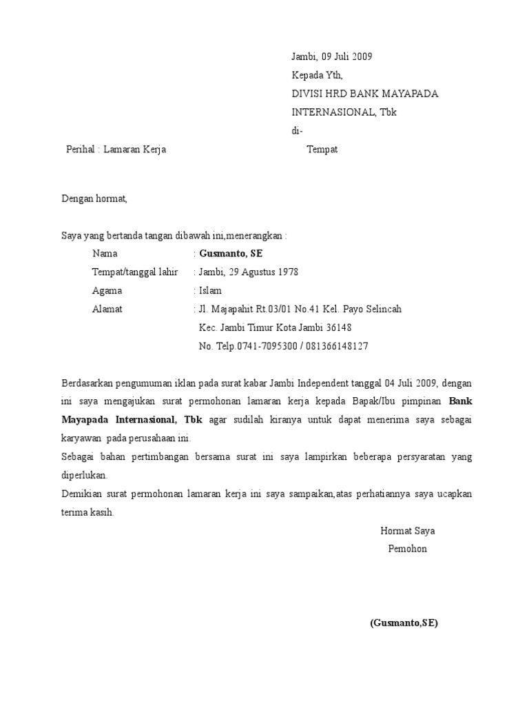 Contoh Surat Lamaran Kerja Bank 9 Jambi
