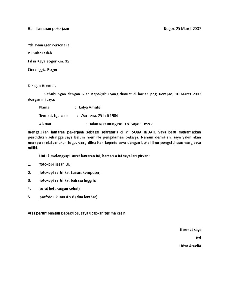 Contoh Surat Lamaran Kerja Sebagai Sekretaris Dalam Bahasa Inggris Dapatkan Contoh