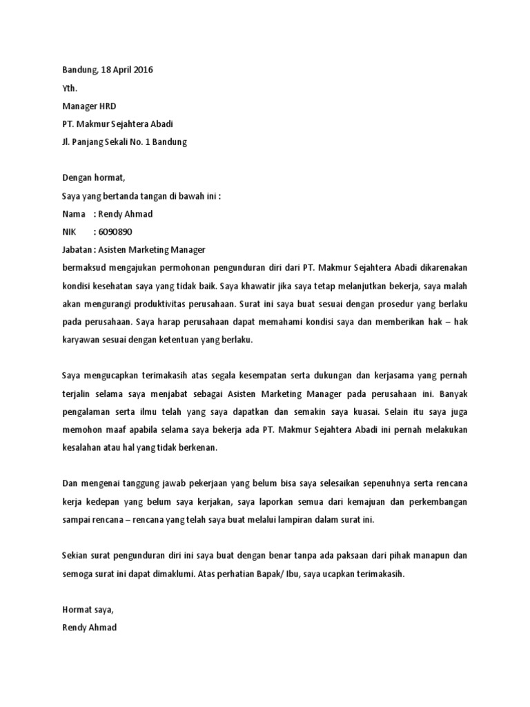 Contoh Surat Resign Pengunduran Diri Karena Sakit Ruangdiary Com