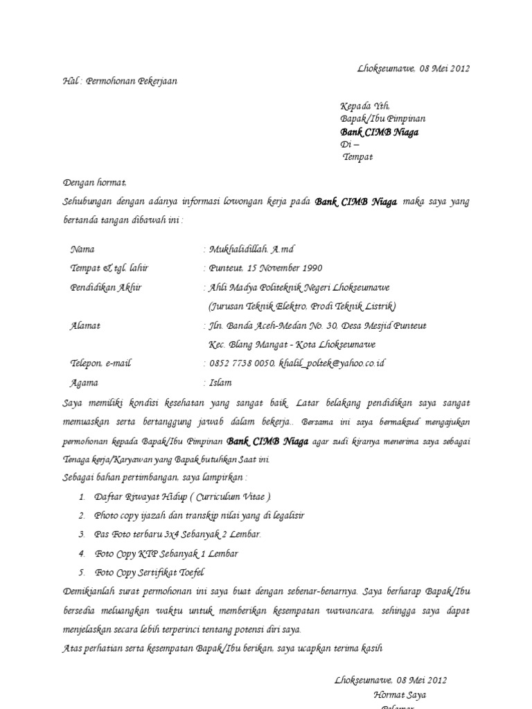 Contoh Surat Lamaran Kerja Di Bank Cimb Niaga