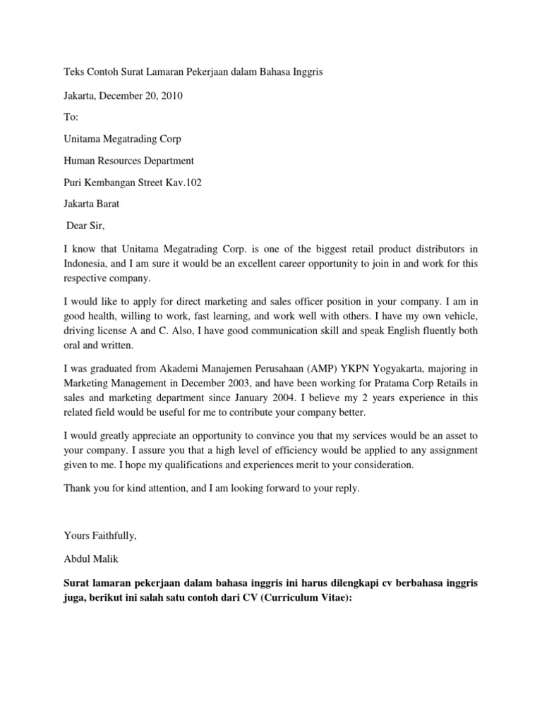 Teks Contoh Surat Lamaran Pekerjaan Dalam Bahasa Inggris Sales Marketing