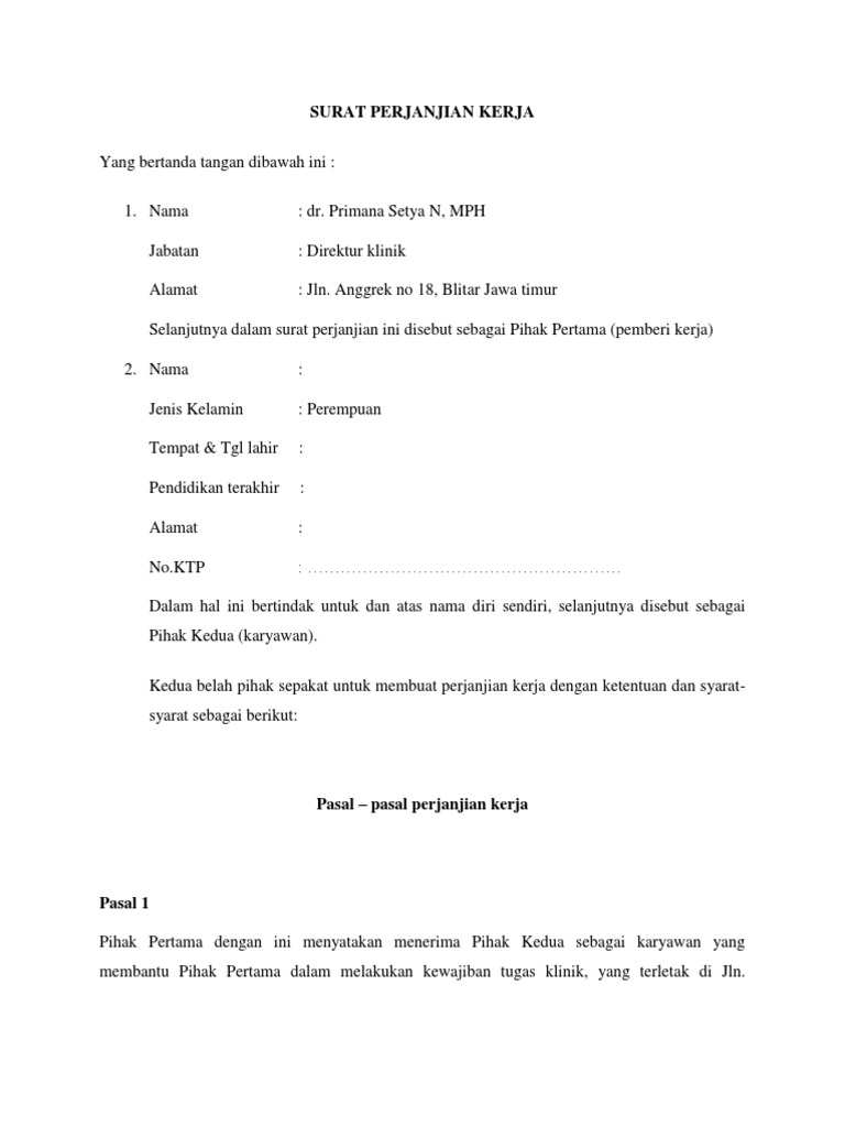 Contoh Surat Perjanjian Kerja Karyawan Rumah Sakit Kumpulan Kerjaan