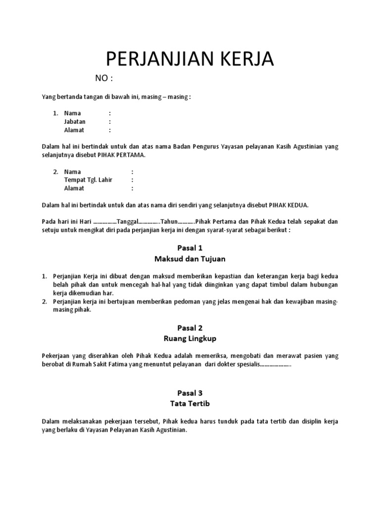 Contoh surat perjanjian kontrak kerja perawat. Contoh surat perjanjian kerjasama hotel yang profesional. Contoh surat perjanjian kerja karyawan. Surat perjanjian kontrak kerja service dan perawatan.