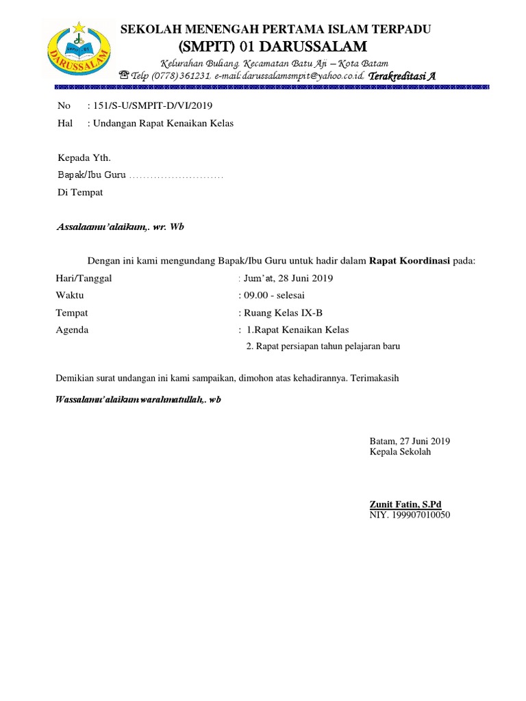 Surat Undangan Rapat Kenaikan Kelas