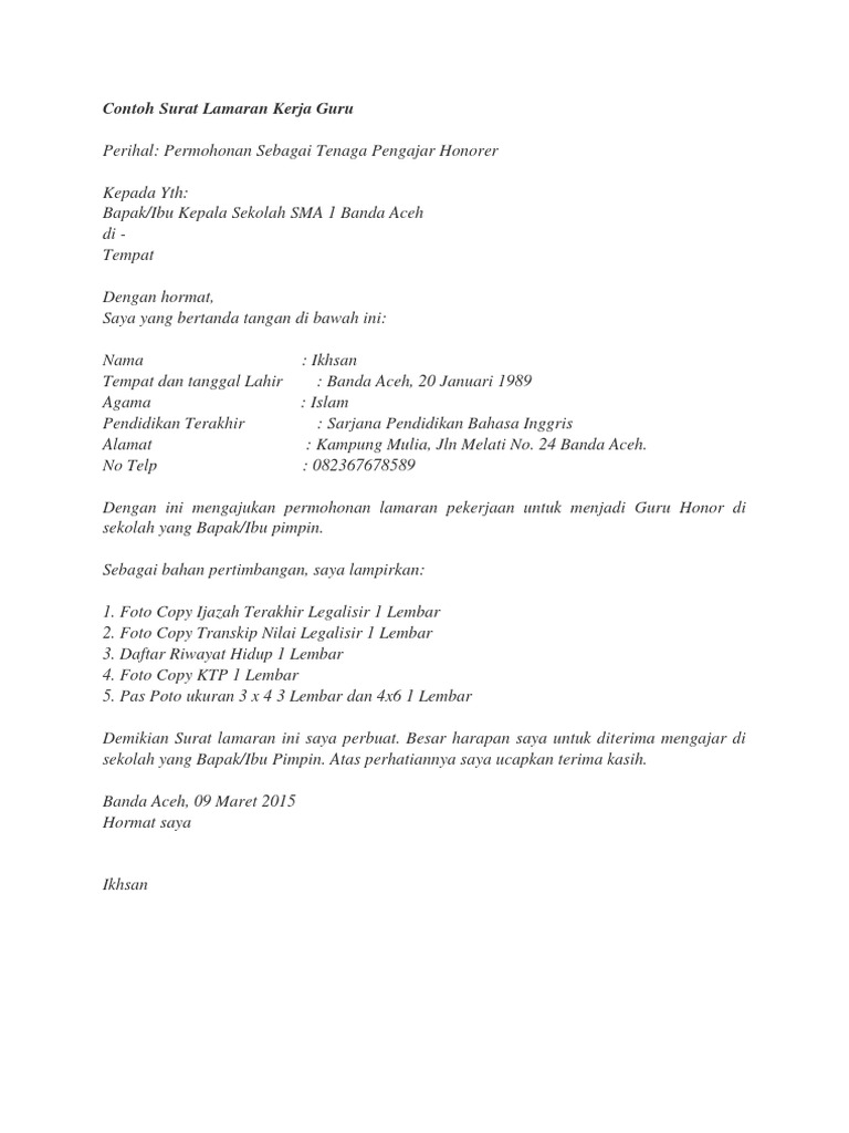 Contoh Surat Lamaran Kerja Guru Honorer Berbagai Contoh