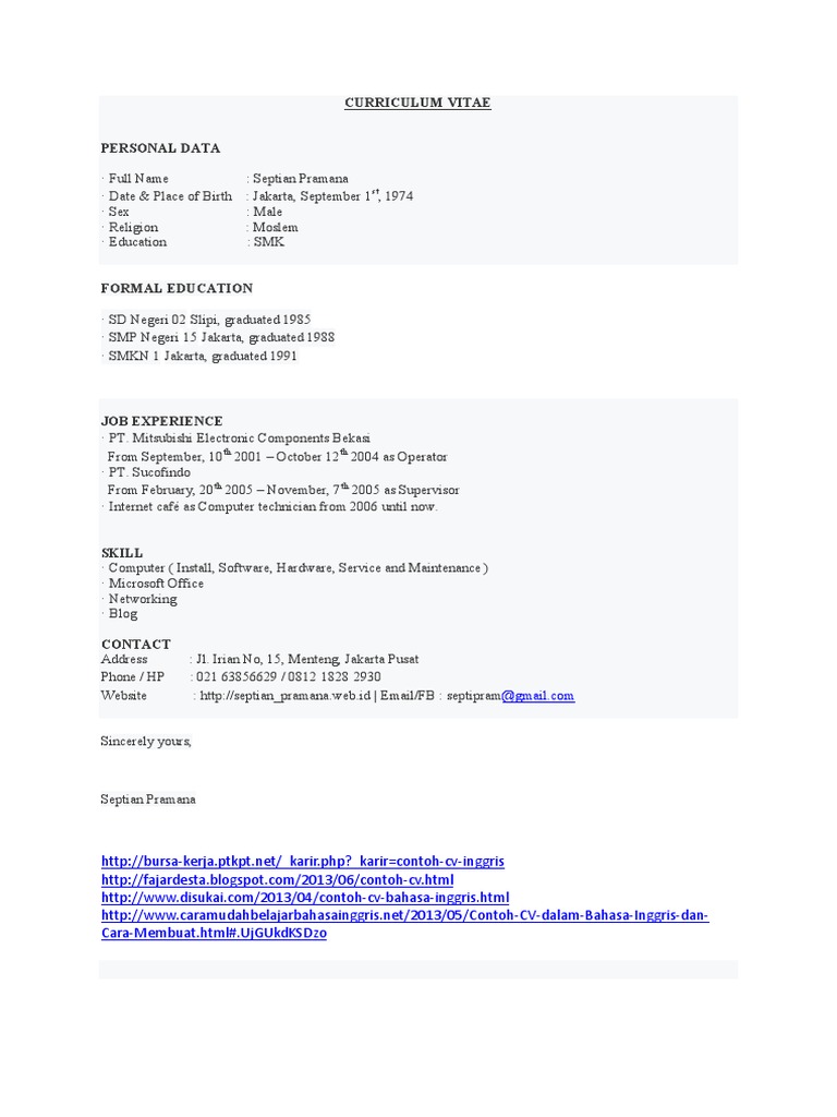 Contoh Cv Formal Bahasa Inggris