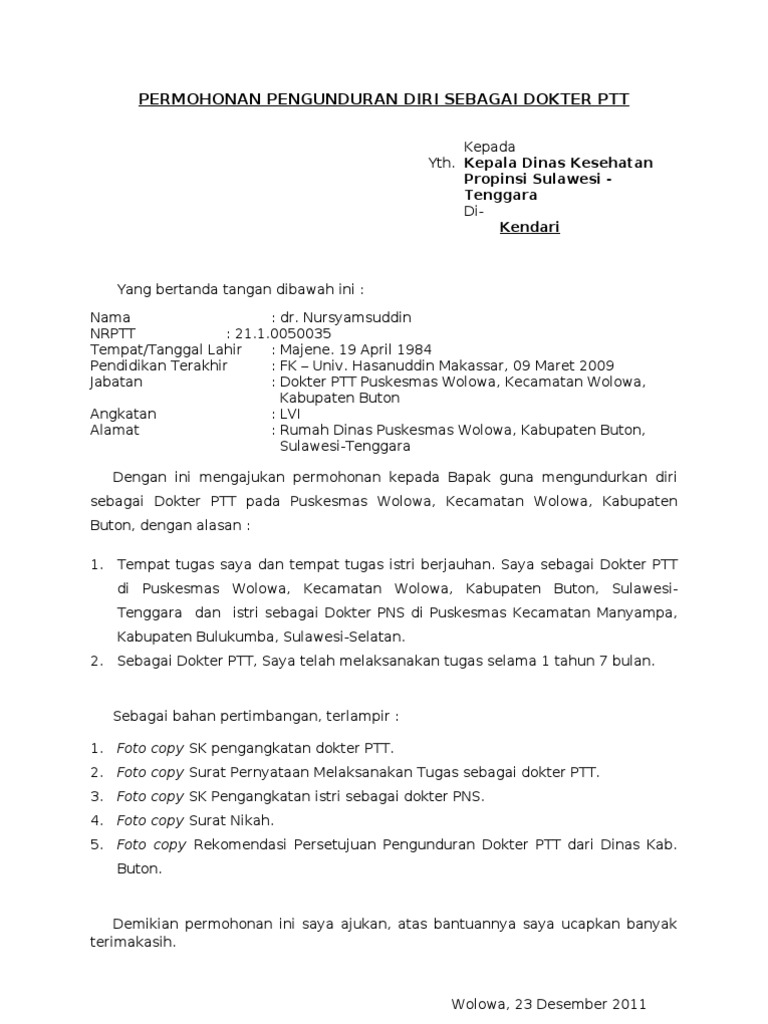 Permohonan Pengunduran Diri Sebagai Dokter Ptt