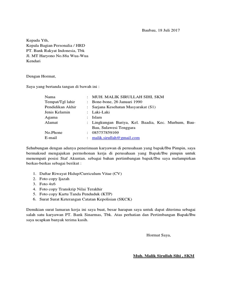 Contoh Surat Lamaran Kerja Di Bank Sultra