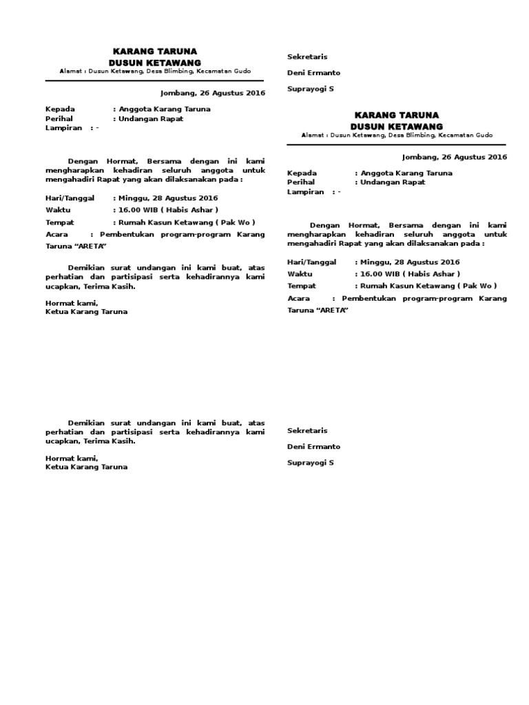 Contoh Surat Undangan Rapat Pembentukan Karang Taruna