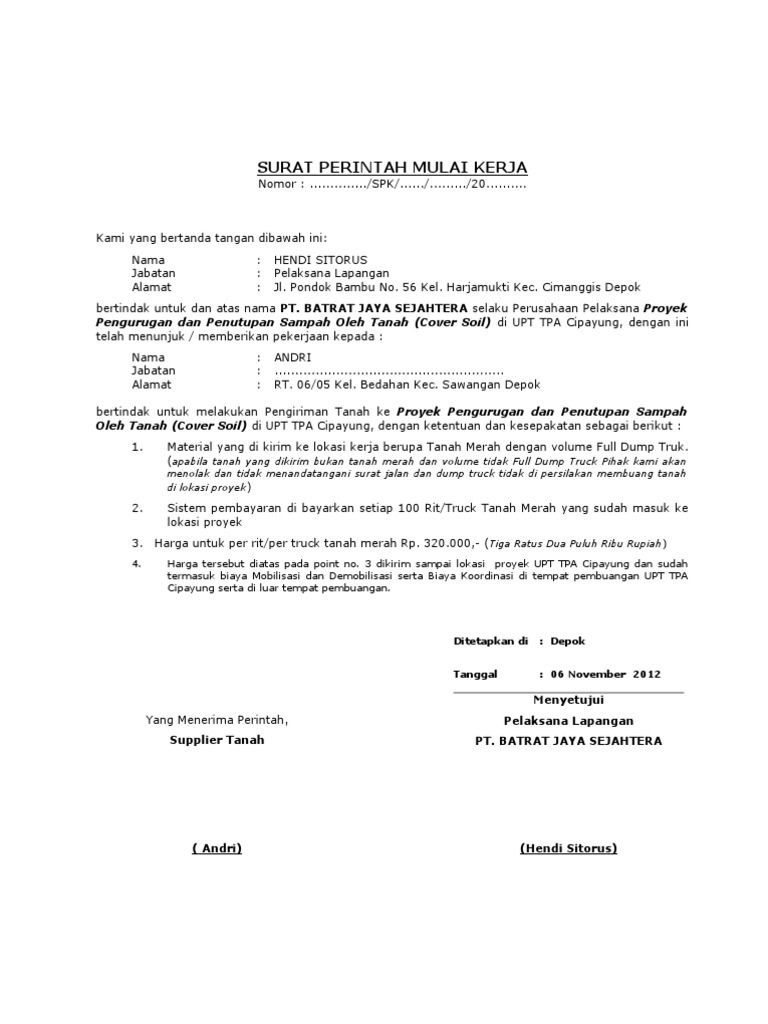 Contoh Surat Perintah Kerja Pengurugan Tanah