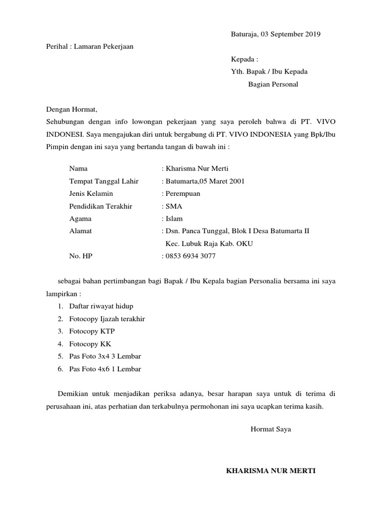 Itulah beberapa contoh surat lamaran kerja yang bisa kamu ikuti. Contoh surat lamaran kerja di perusahaan seringkali dicari oleh para pencari kerja yang ingin mengajukan lamaran pekerjaan di perusahaan perusahaan yang ada di indonesia. Manajer personalia pt vivo.