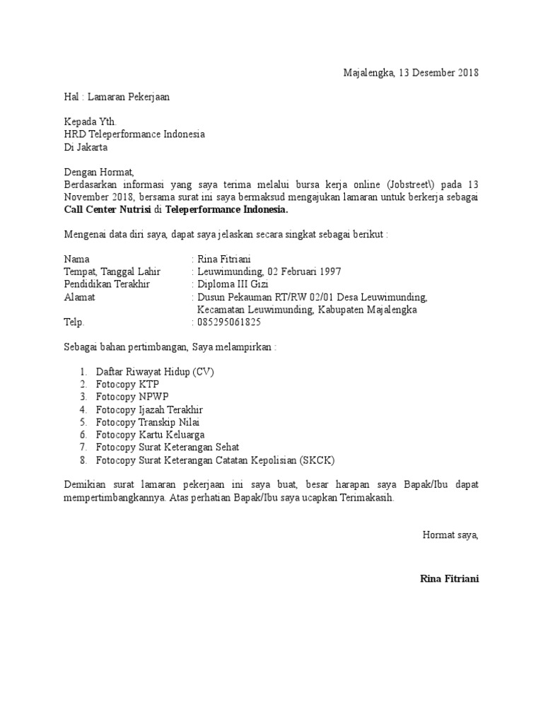 Surat Lamaran Kerja Rina Teleperformance