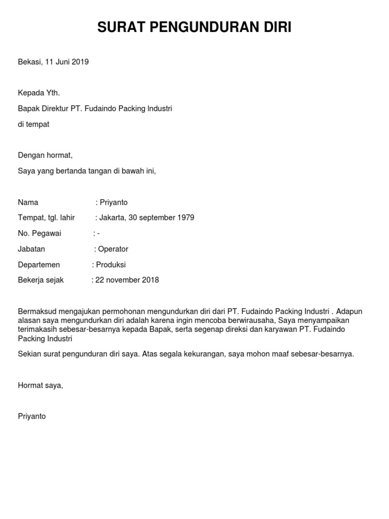Contoh Surat Pengunduran Diri Kerja Resign Yang Baik Dan Benar