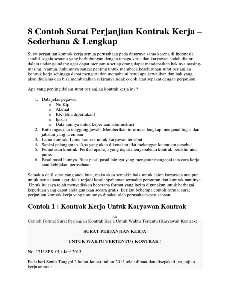 8 Contoh Surat Perjanjian Kontrak Kerja Docx