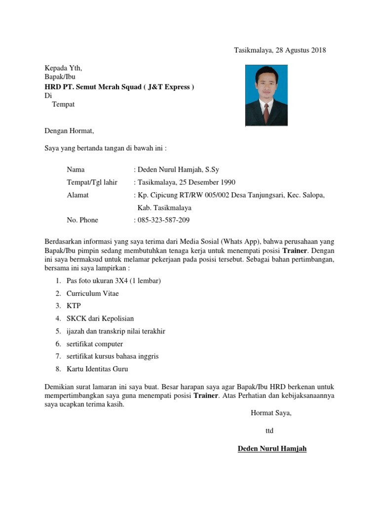 Contoh Surat Lamaran Kerja J T Express Gawe Cv