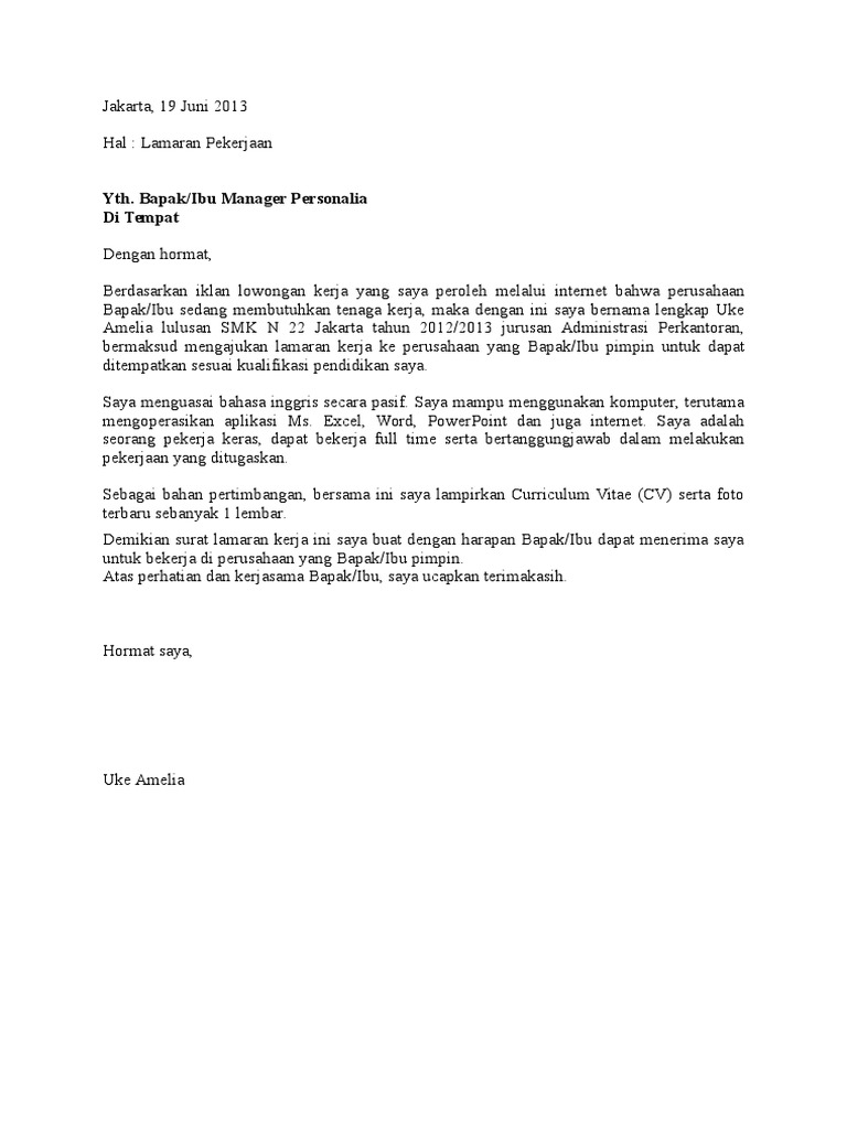 Contoh Surat Lamaran Kerja Bahasa Inggris Lulusan Smk
