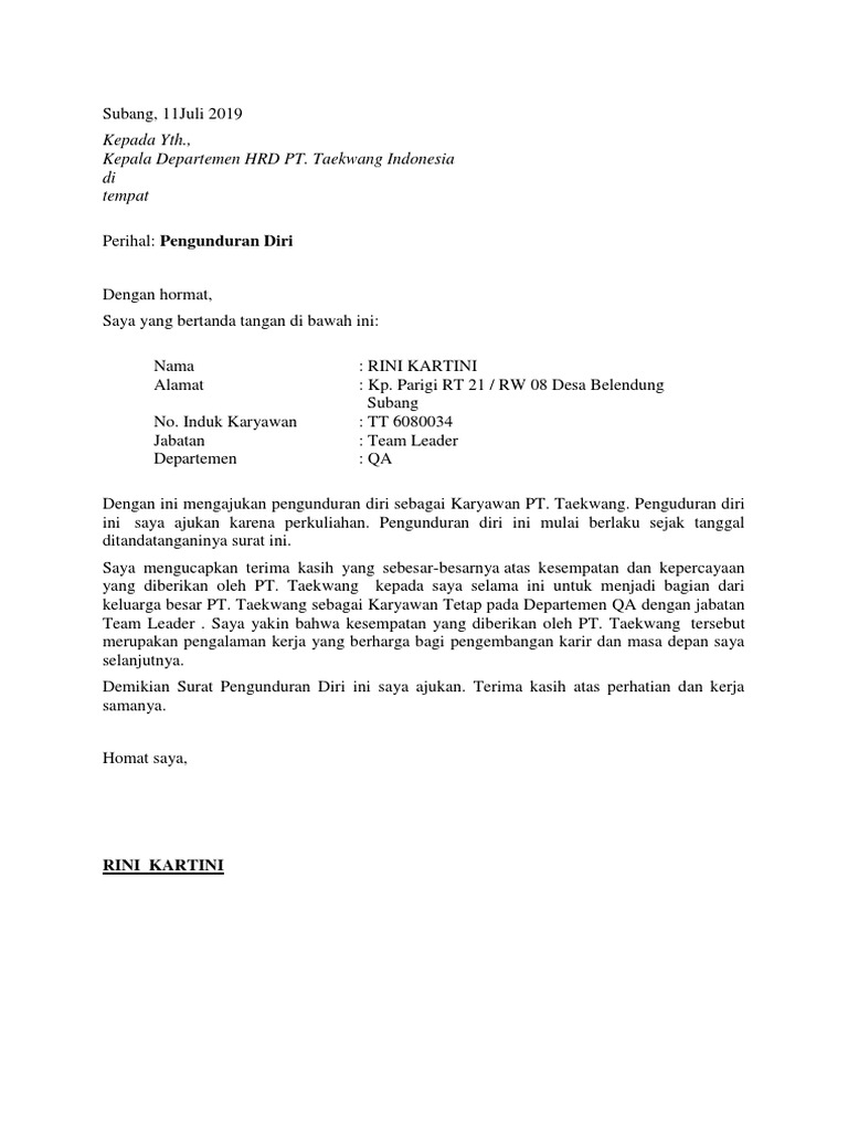 Contoh Surat Pengunduran Diri Karyawan Perusahaan Atau Pabrik Ydhartono Com