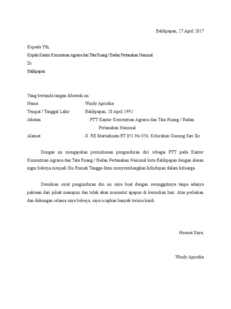 Contoh Surat Pengunduran Diri Kerja Yang Baik Dan Sopan