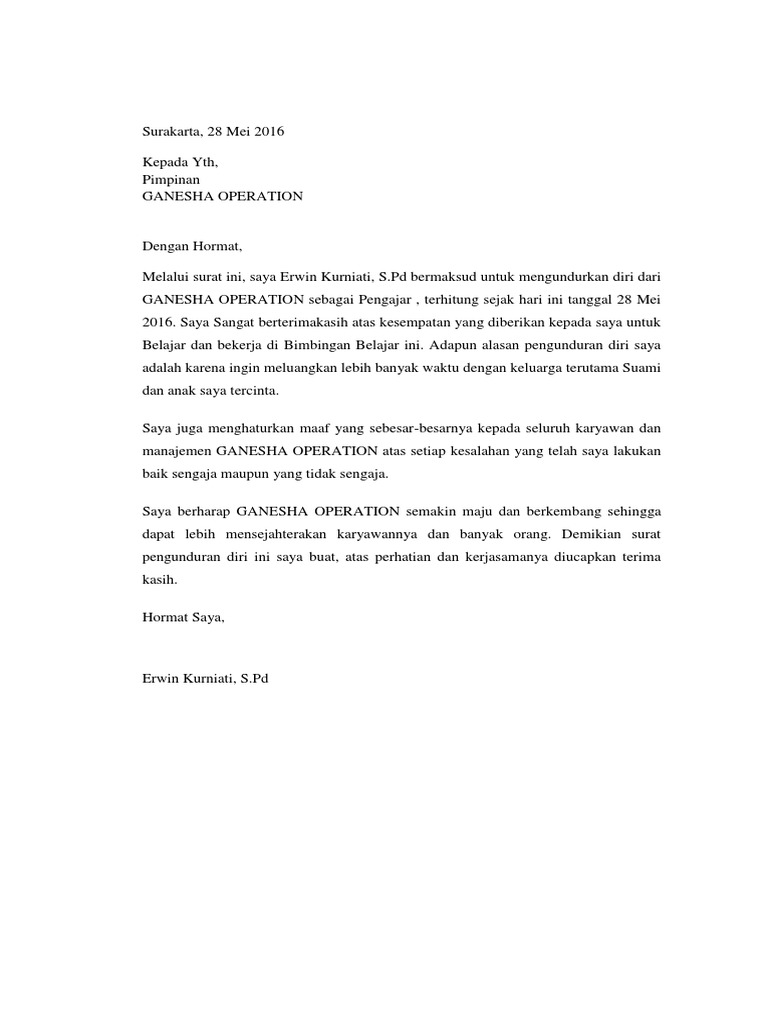 Hrd manager pt mandiri jaya indonesia jl. Contoh surat pengunduran diri karena keluarga contoh surat pengunduran diri dari perusahaan. Namun tidak menutup kemungkinan dengan alasan tertentu seseorang memutuskan untuk mengundurkan diri dari perusahaan yang bersangkutan.